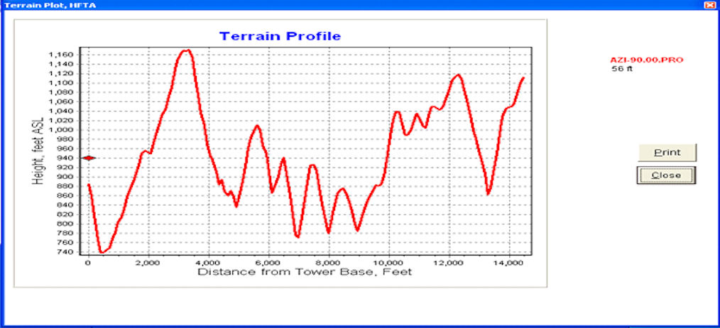 Note the vertical scale is drastically compressed compared to the horizontal scale, which exaggerates the terrain features. It is not as bad as it looks! The dominant feature which creates positive enhancement to low angle radiation is the steep drop in elevation immediately under the antenna. The situation is not as good as it could be because of the approximate 825’ ASL parallel hill at about 1500’ in front of the antenna and in particular the higher 1,020’ hill about 4,000’ out. The later terrain feature impinges on the lowest angles and is close enough to detract somewhat from the performance. As the antenna turns clockwise from 45 degrees toward the east, this particular ridge feature moves closer to the antenna and progressively blocks the lower angles, until at about 90 degrees azimuth the performance is seriously degraded. On the other hand, as the antenna turns north from 45 degrees, the major blocking ridge moves out of the field and the low angle performance recovers. Here is the 90 degree terrain profile: